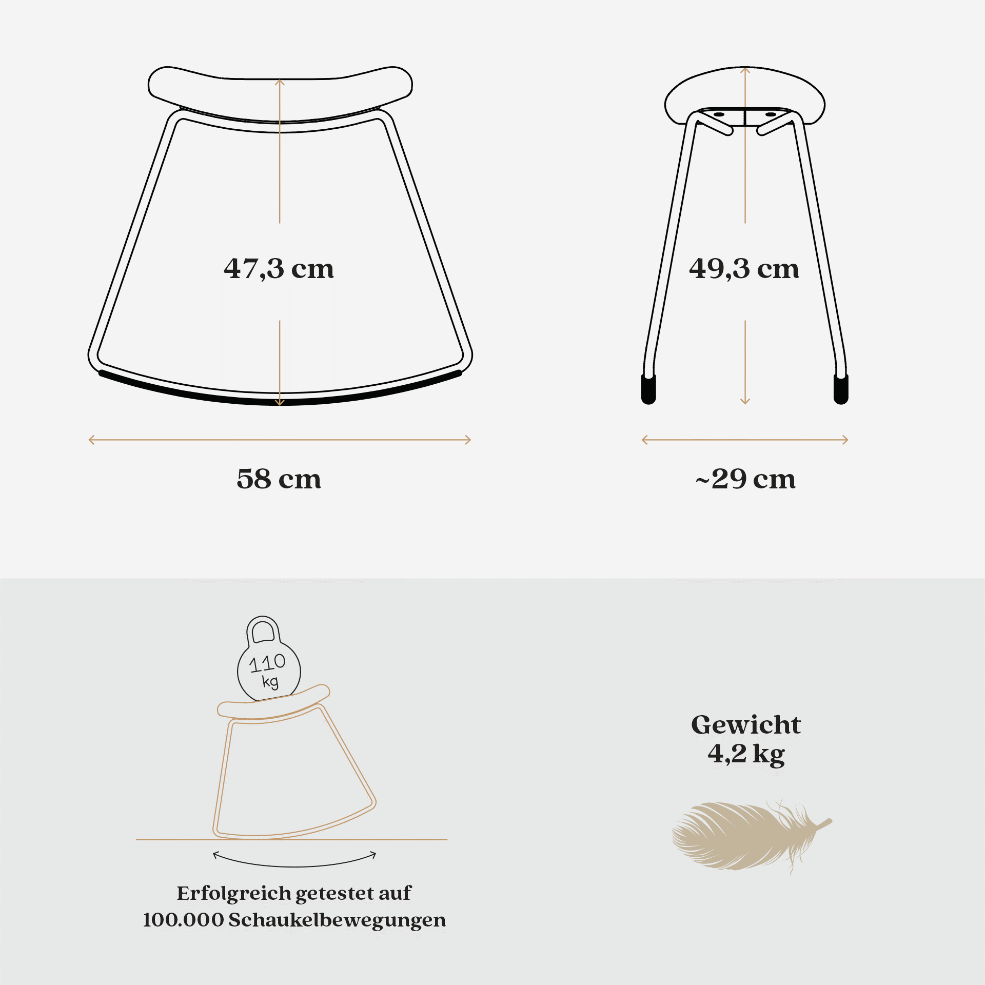 Der Hocker hat einen Test mit 100.000 Schaukelbewegungen und 110 kg Gewicht erfolgreich bestanden.