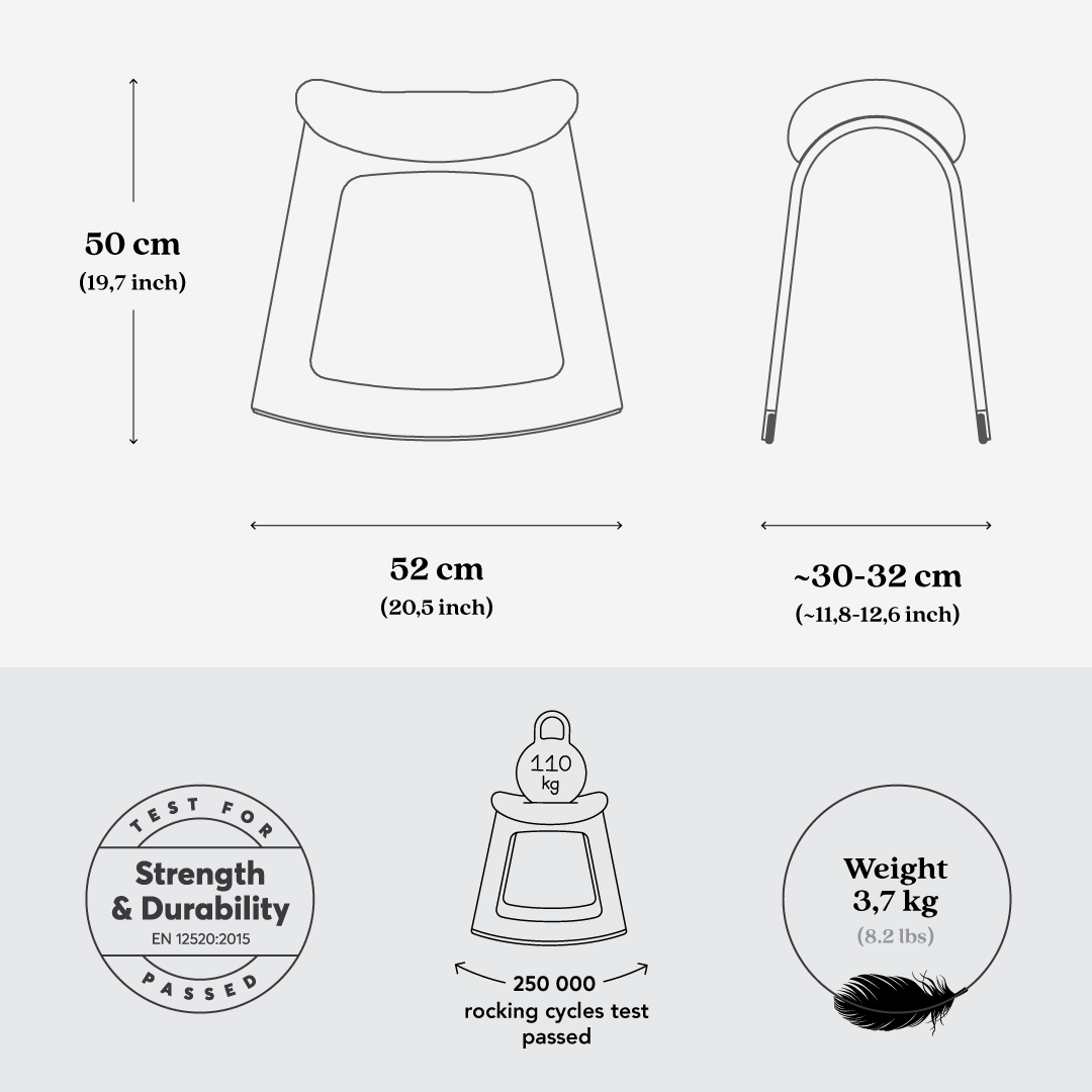 Il sedile è rivestito da un tessuto in lana o in poliestere riciclato. La seduta poggia su una struttura robusta in compensato di faggio dotata di pattini in gomma. Poiché non presenta parti che si possono rompere, la sedia può durare per molti anni.