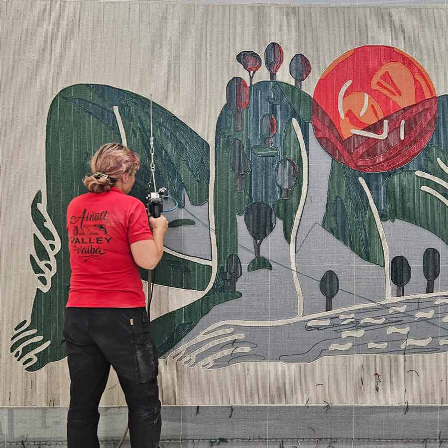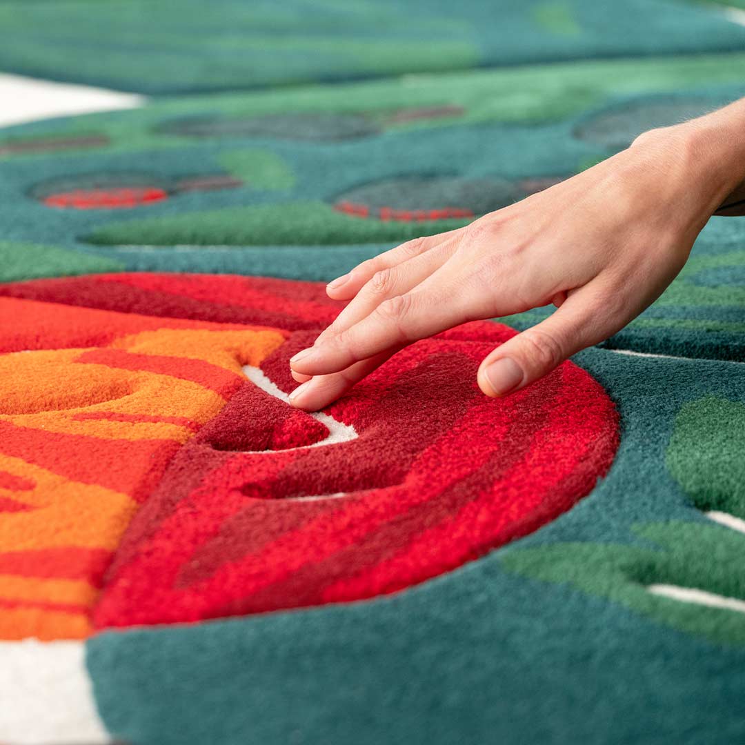 This designer rug is handmade by Estonian specialists who have nearly 30 years of experience in crafting hand-tufted natural carpets and rugs. Working closely with artist Lina Sasnauskaitė, they guided her through the process of translating her original artwork into the tactile medium of a wool rug.